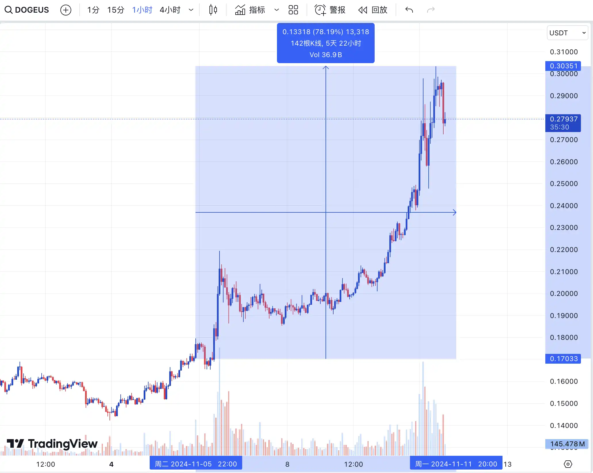 DOGE 作为最早的 Meme 币,是模因文化的开端,背后更有 Elon Musk 的站台,Elon Musk 曾声称会让 DOGE 站上单币 1 美元的价格,Trump 的竞选成功离不开 Elon Musk「金牌辅助」的效果,市场上对于 DOGE 的炒作也极其热烈。从加密市场对 Trump 竞选活动产生反应,即 11 月 5 日的美盘时间以来,DOGE 最高上涨 78.19%,市值现报 411.41 亿美元,目前暂列市值排行榜第六位。