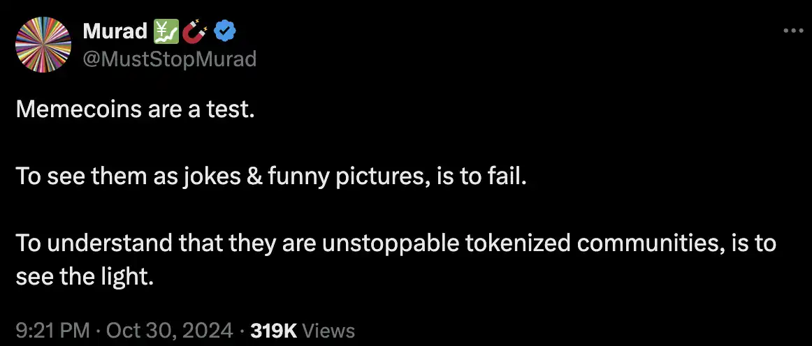 正如 Murad 在社交媒体发文所说「理解 Meme 是不可阻挡的代币化社区,才是真正的领悟。我们正处于 Meme 币超级周期的早期阶段。」
