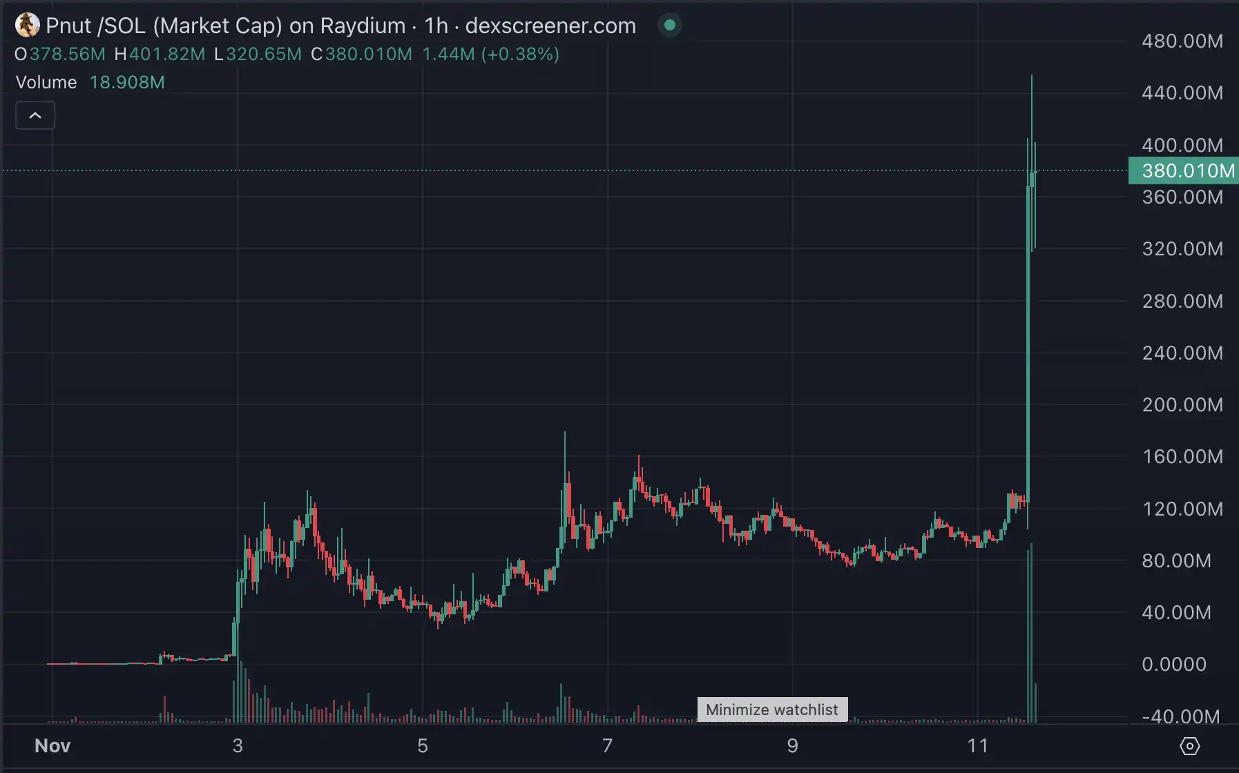 Pnut 是七年多前机械工程师 Mark Longo 在目睹一只小松鼠的母亲遭遇车祸不幸身亡而将其带回家饲养的小宠物的名字「Peanut」,而在 10 月 30 日纽约州环境保护厅的官员在没有搜索领的情况下,逮捕了 Peanut 并实施了安乐死。Peanut 被认为是「非法饲养的野生动物」,而大众并不认可,美国讽刺新闻网站巴比伦蜜蜂(Babylon Bee)表示,「戴着 MAGA 帽子的激进松鼠开始起义。」Elon Musk 也多次在社交媒体发文声援 Peanut,这场关于 Peanut 的风波被发教程异常对于民主党的讨伐活动,甚至是政治较量的舆论武器。在 2024 年 11 月 11 日东八区时间 13:38,Binance 发布公告上线 Pnut,Pnut 应声大涨,最高涨幅接近 4 倍。