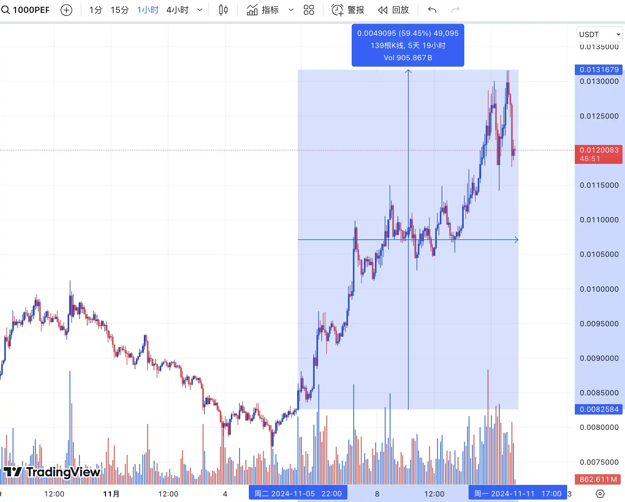 Pepe 是 2024 年热度相当高的 Ethereum 网络上的 meme,青蛙 Pepe 本身已经在 Web2、Web3 网络上都很出圈,作为老 meme,今年的表现也相当优异,配合着比特币 2-3 月的优异表现也走出了一段「主升浪」行情,从加密市场对 Trump 竞选活动产生反应,即 11 月 5 日的美盘时间以来,最高上涨 59.45%,市值现报 51 亿美元。