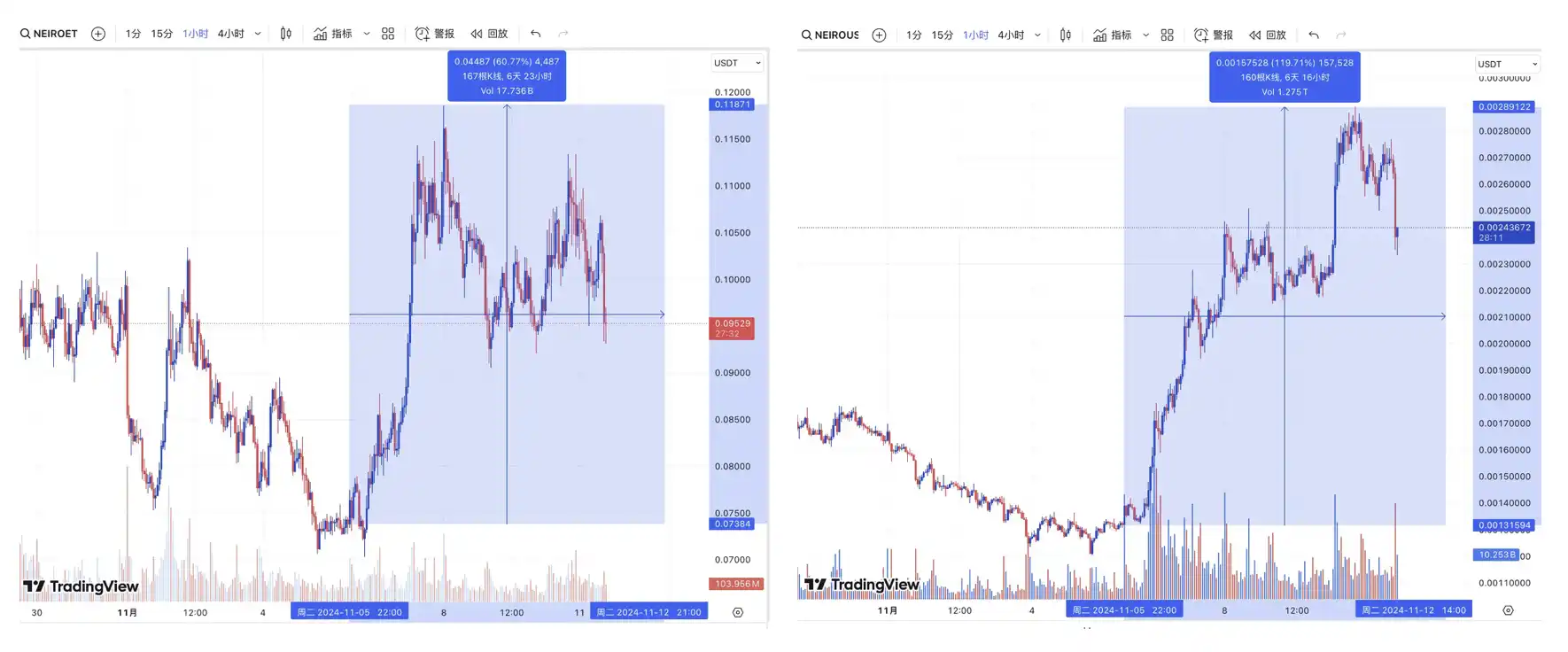Neiro 作为在 Doge 去世后接替他的新的柴犬,自从发币以来的热度就很高,市场中不少人都觉得 Neiro 会复制 Doge 的致富神话,在 Ethereum 上之后还出现了大写小写之争。从加密市场对 Trump 竞选活动产生反应,即 11 月 5 日的美盘时间以来,NeiroCTO 最高上涨 119.71%,市值现报 10.2 亿美元,Neiro 最高上涨 60.77%,市值现报 9386 万美元。
