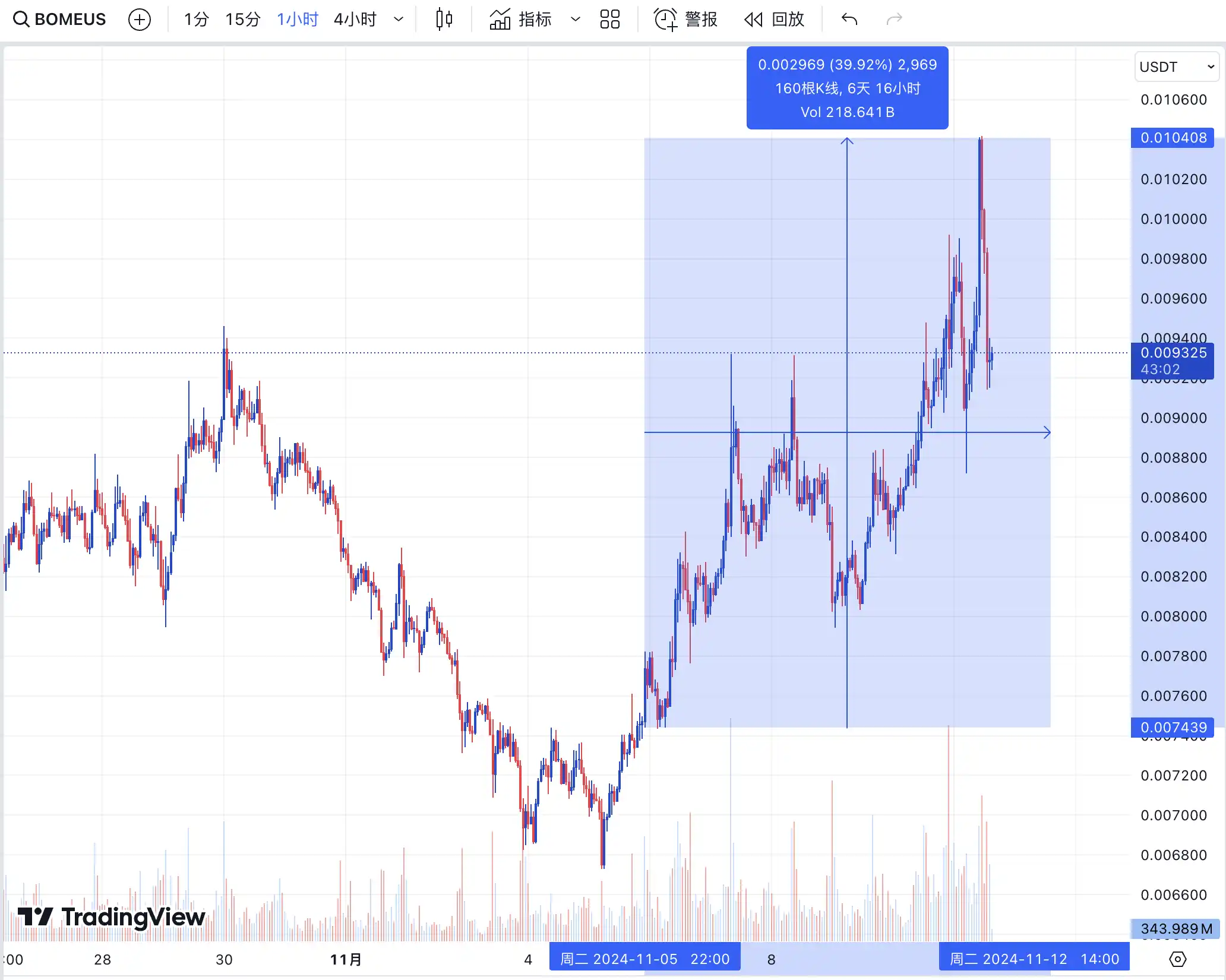 Bome 也是 2024 年 Solana 的链上「金狗」,来源于一位艺术家对于青蛙的艺术创作创建的 Book Of Meme,旨在记录所有的模因文化,也创下了三天上头部 CEX 的记录。从加密市场对 Trump 竞选活动产生反应,即 11 月 5 日的美盘时间以来,最高上涨 40.00%,市值现报 6.4 亿美元。