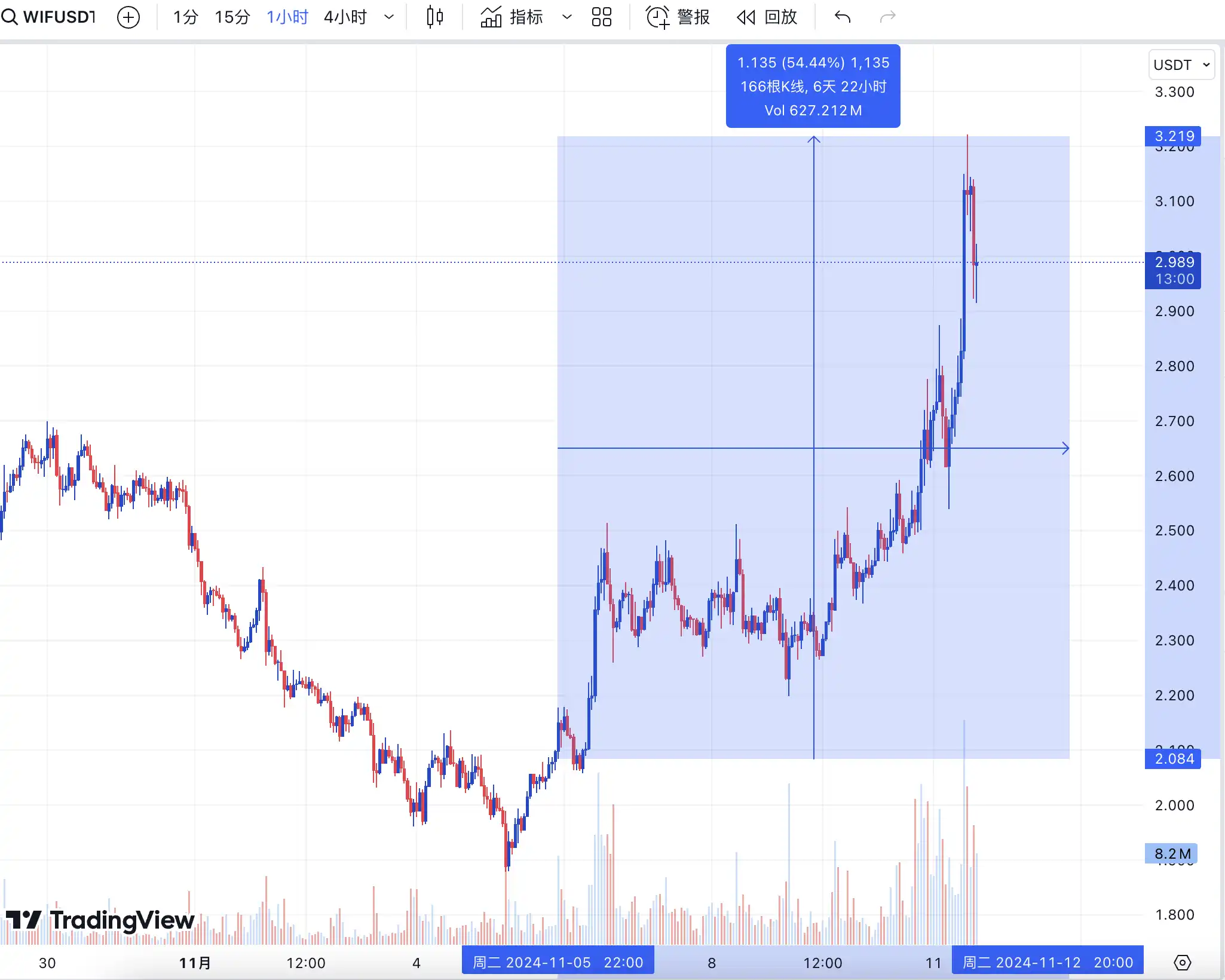 DogWifHat 可以称得上 2024 年上新在 CEX 上表现最好的 meme 币了,以 0.3 美元的价格上线 Binance 合约之后经过简短的盘整之后最高到达 4.8 美元,最高涨幅到达 16 倍。传奇交易员 Nachi 在 WIF 上最高获利超过两千万美元,WIF 目前是 Solana 生态 Meme 中市值最大的 Sol 生态 Meme「龙头」,从加密市场对 Trump 竞选活动产生反应,即 11 月 5 日的美盘时间以来,最高上涨 54.44%,市值现报 30.1 亿美元。