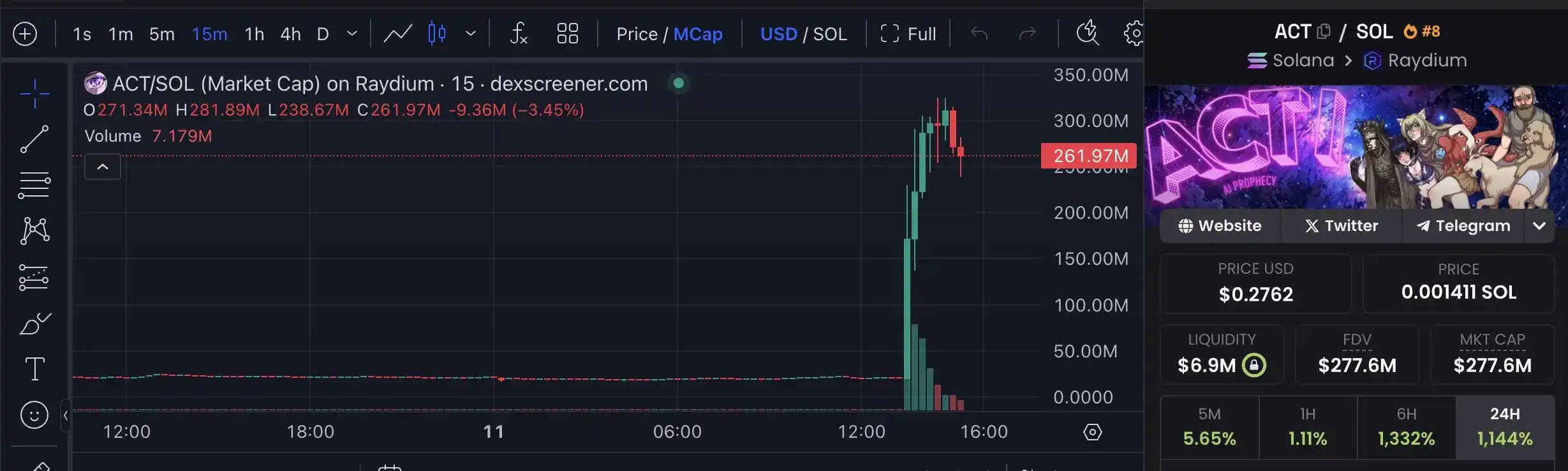 DEX Screener 数据显示,截至发文,ACT 的日内最高涨幅达 1445.4%,市值一度从 2000 多万美元飙升至最高 3 亿美元,过去 24 小时交易量超 2.3 亿美元。