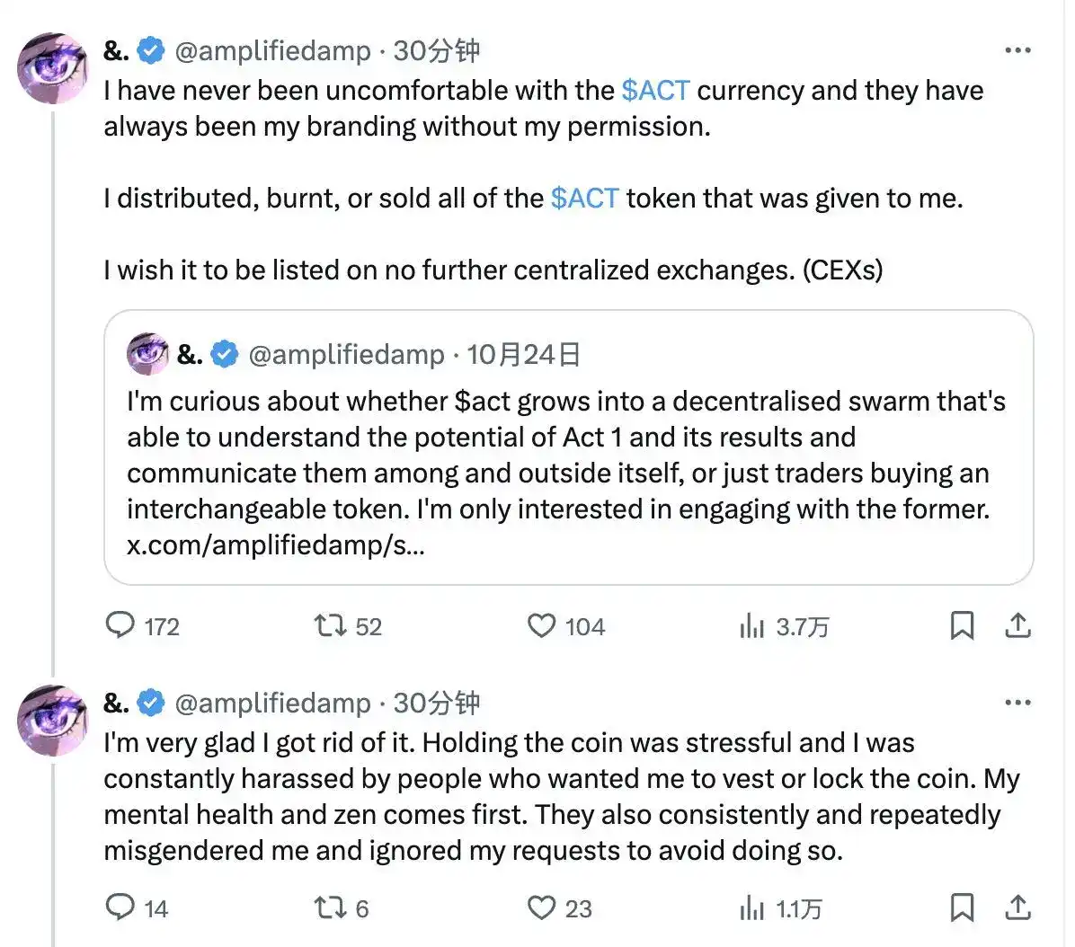 「之所以大家痛骂 amp 是他在出货方式上一次次欺骗社区,而不是应不应该出货,全部出掉对 ACT 是一种利好,从此社区只需要专注在 ACT 的理念和这个去中心化研究项目,以及未来支持更多的『AI Crypto』项目上。且 ACT 社区已经不止是基于 ACT 项目,更是一种『行动』,用加密社区的方式,推进 Ai 发展的『行动』?」ACT 中文社区建设者 0xWizard 曾在 amp 最后一次抛售代币时表示。
