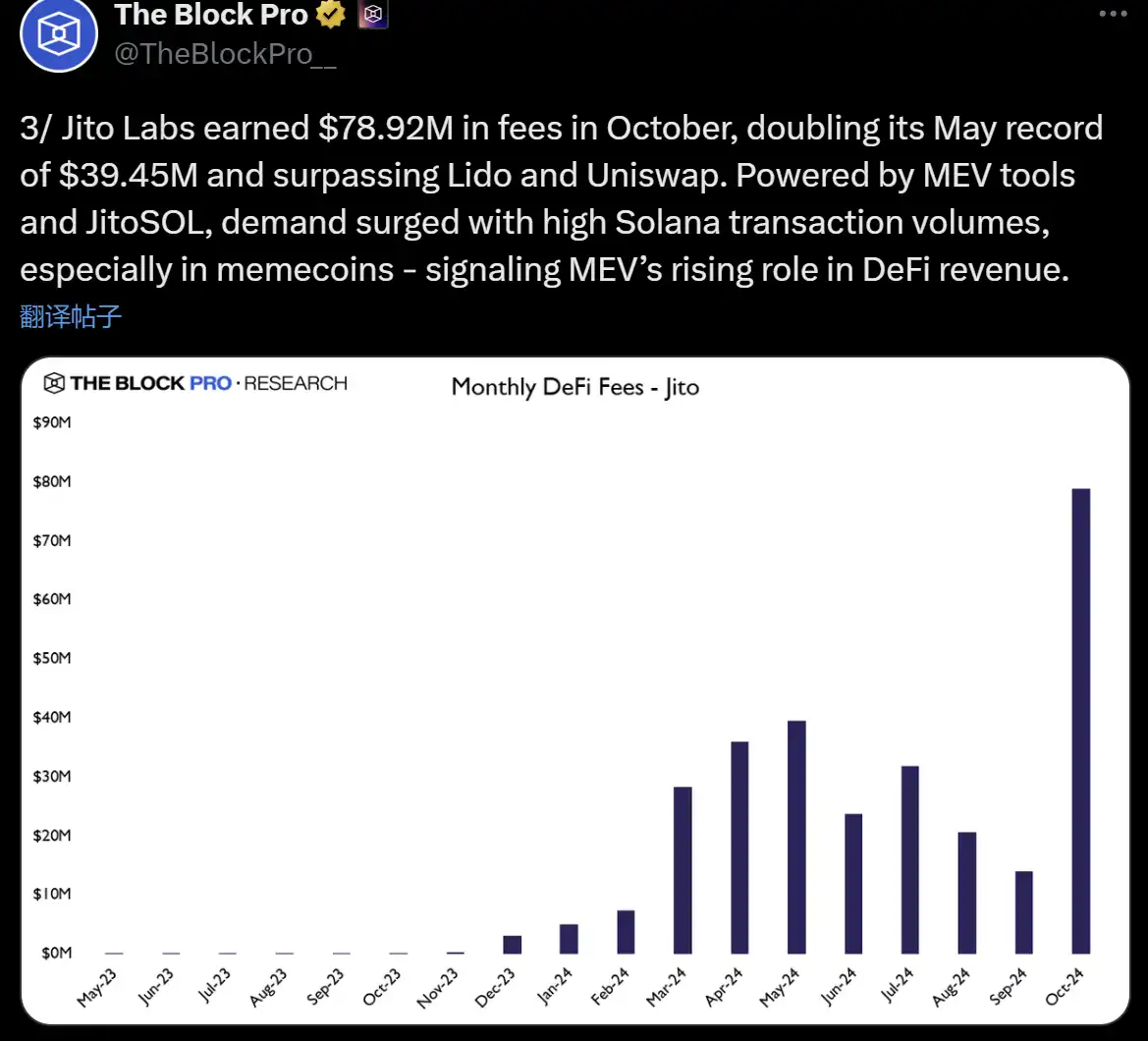 2.Jito Labs 10 月份的费用收入为 7892 万美元,是 5 月份 3945 万美元的两倍,超过了 Lido 和 Uniswap。在 MEV 工具和 JitoSOL 的支持下,需求激增,Solana 交易量很高,尤其是在 memecoin 方面——这表明 MEV 在 DeFi 收入中的作用日益增强。@TheBlockPro__