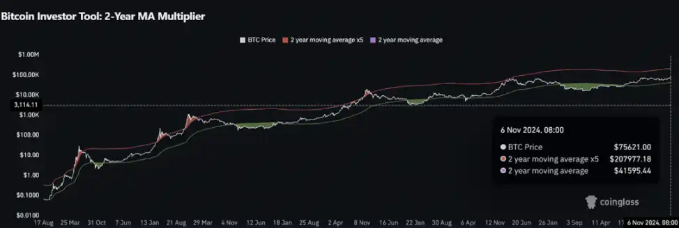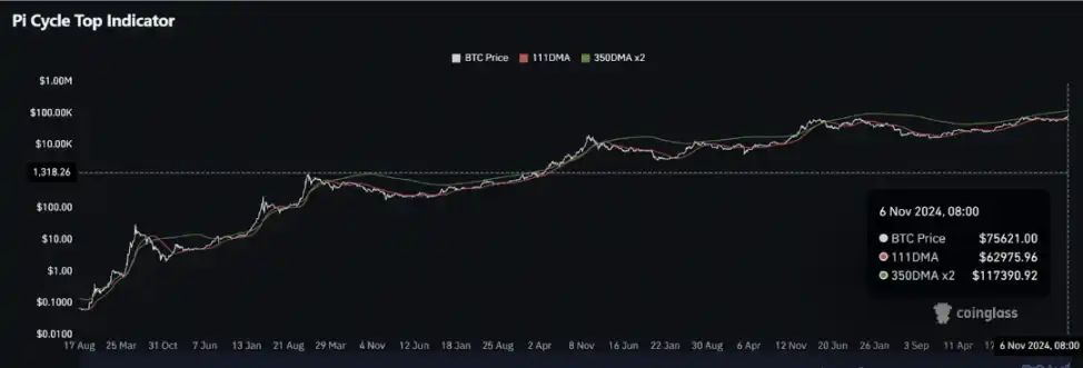 根据最新的图表资讯,2024 年 11 月 6 日时,比特币价格约为 75,621 美元,而 350DMA x 2 的价位约为 117,390 美元。这表示当比特币价格接近或超过此价位时,可能是本轮行情的顶部信号。