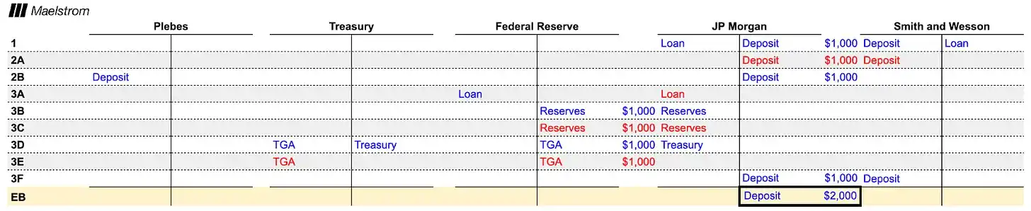 接下来,财政部通过发行 1000 美元的新债务来资助补贴。摩根大通前来竞购,但由于缺乏储备金而向美联储的贴现窗口申请贷款。以史密斯威森的公司债务作为抵押,摩根大通获得储备金来购买财政部的国债。财政部随即向史密斯威森支付补贴,这笔款项成了摩根大通账户上的存款。
