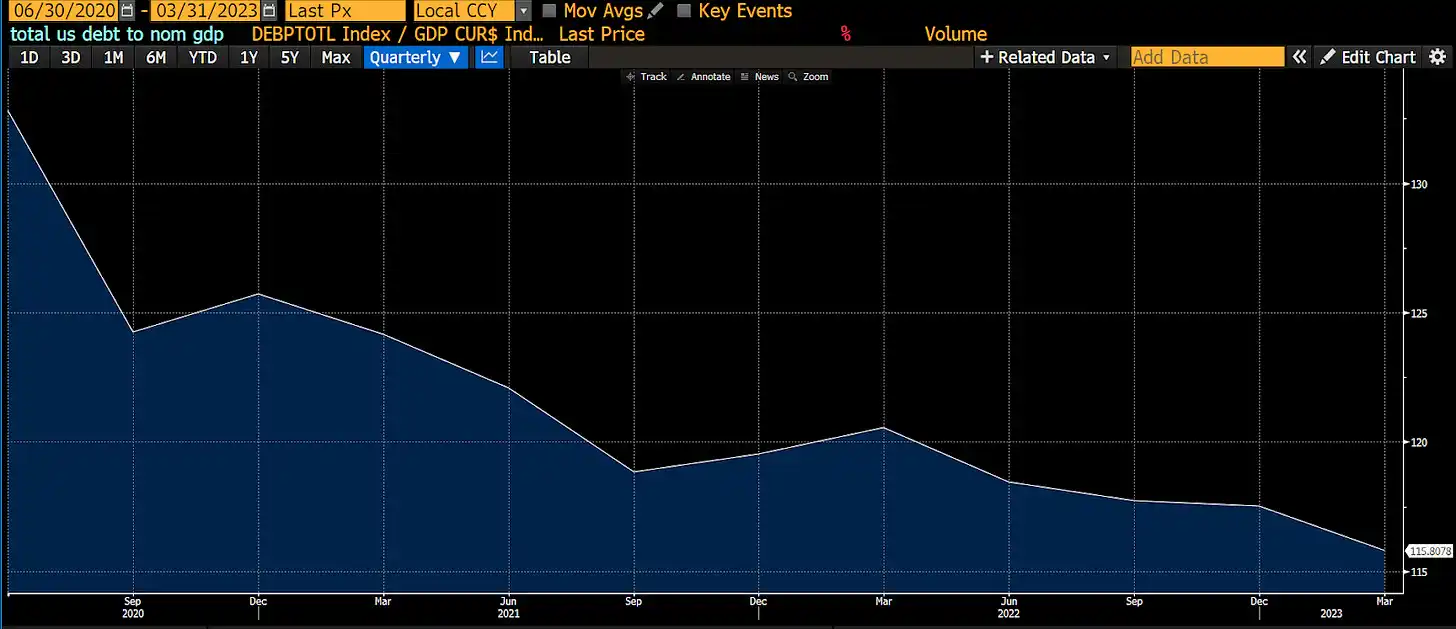 穷人之所以穷,通常是因为他们会把所有钱花在商品和服务上,而他们在这一时期确实如此。这种消费行为使货币流通速度大幅提升,超过 1。这意味着,每增加 1 美元的债务,就能产生超过 1 美元的经济活动。于是,神奇地,美国的债务与名义 GDP 之比下降了。
