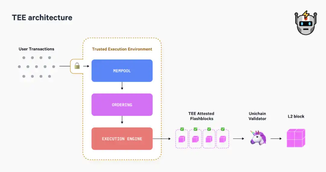 Unichain 是一个 optimistic rollup,旨在执行近乎即时的交易,同时使用隐私技术 TEE 来最大限度地减少对链上 LP 和交换者的潜在影响。