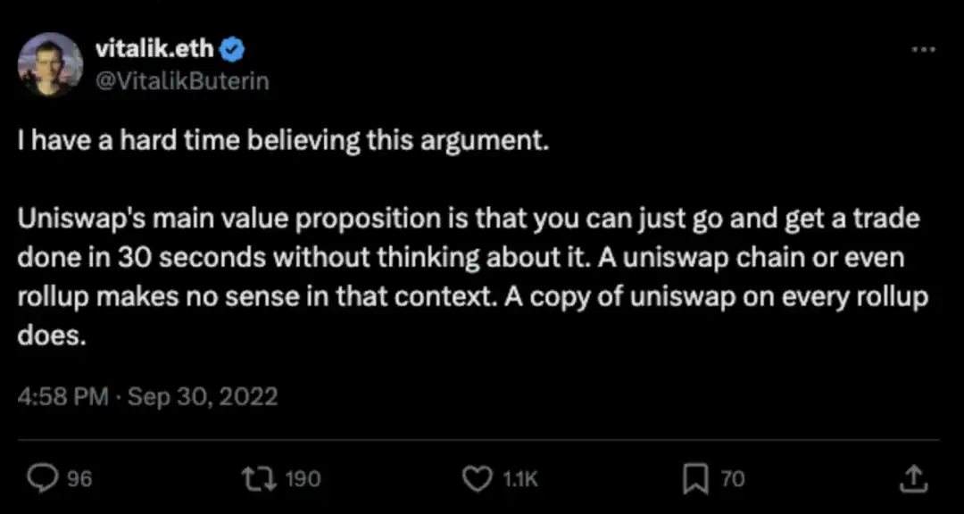 虽然这些愿景令人印象深刻,但用户质疑是否需要另一个 L2,包括 Vitalik 在内的一些人评论 Unichain =「每个 Rollup 上的 Uniswap 副本都是如此」。换句话说,他认为在新链上启动 Uniswap 克隆实际上与启动 Unichain 本身具有相同的目的。