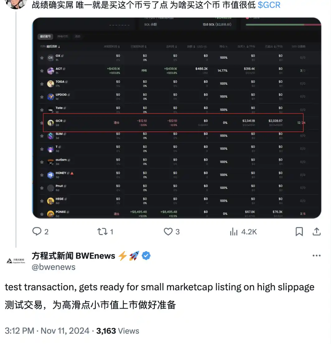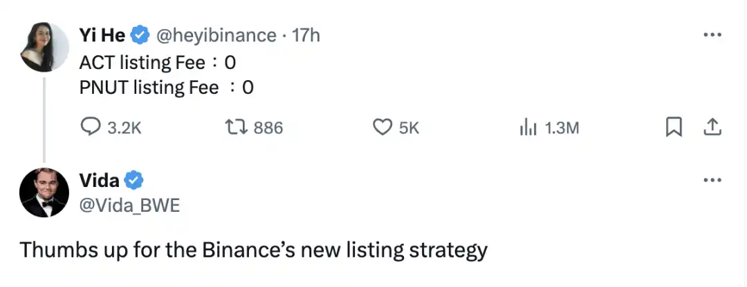 在这笔「新闻交易」大赚后,他还不忘在 Binance 联合创始人何一回应 ACT 、PNUT 上币费为零的推文下为 Binance 的上币策略竖起大拇指。