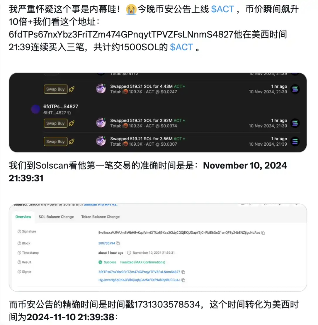 在 Binance 宣布上线 ACT 后的几秒内,他花费 1,558 SOL(约 32 万美元)购买了 1090 万个 ACT,现价值 340 万美元,在 10 分钟内利润超 2000 万人民币!(截止 Lookonchain 发文时)