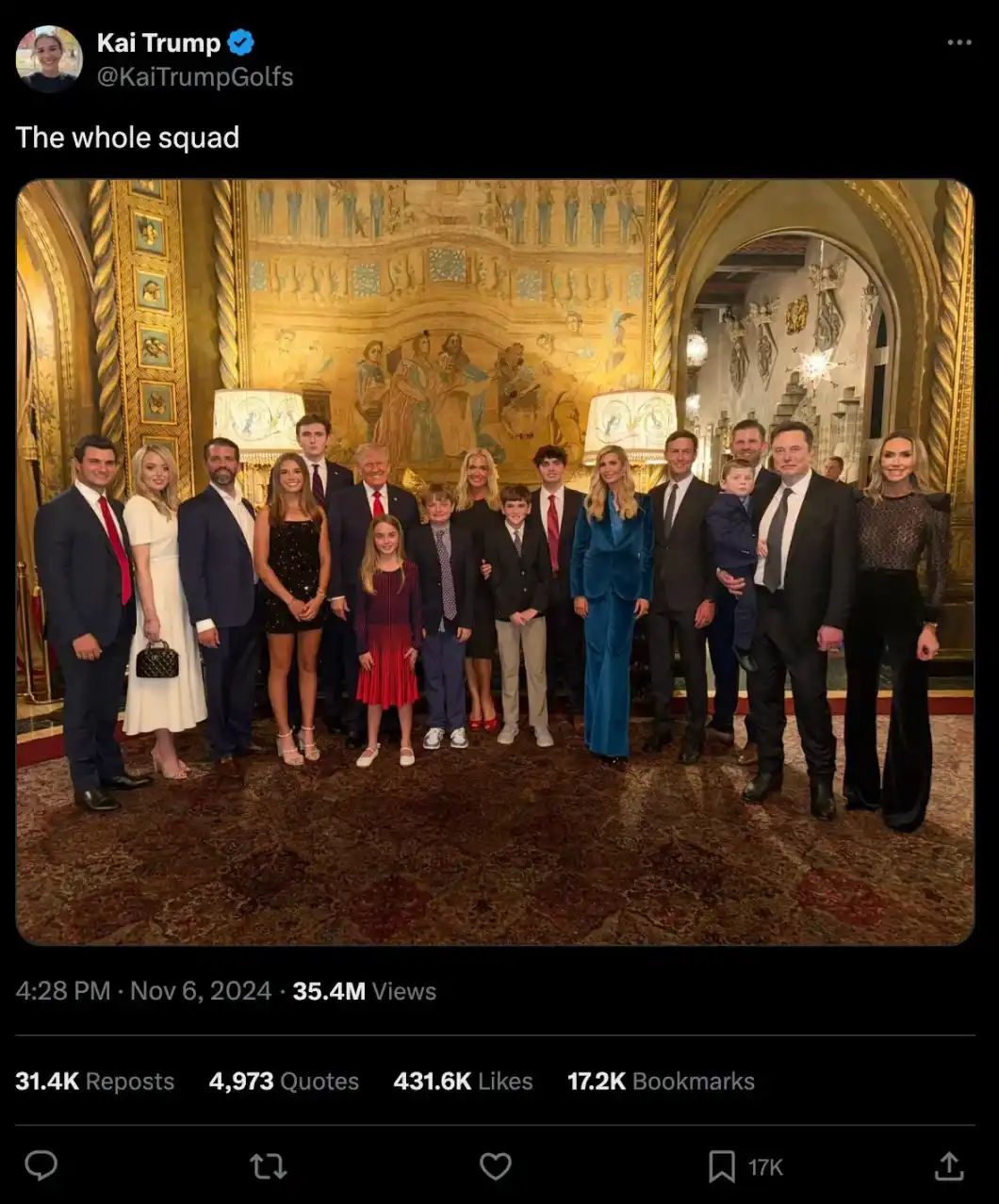 马斯克与特朗普家族成员在海湖庄园。图片来源:Kai Trump 的推特