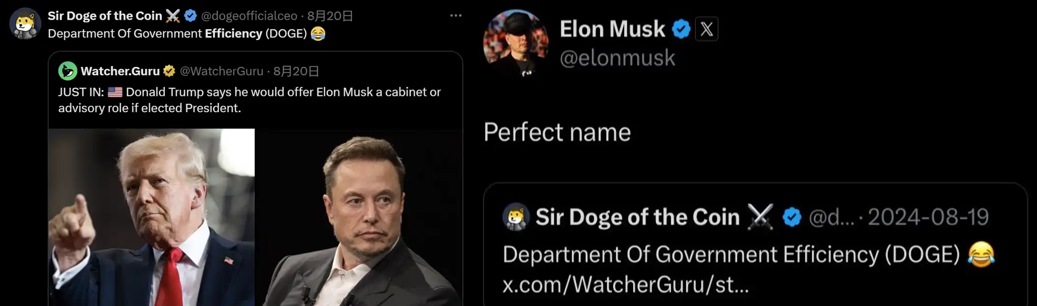 故事的开始是在今年 8 月 20 日,特朗普宣布如果成功当选总统将会任命马斯克为内阁或政府顾问。就在外界对于马斯克任职职位议论纷纷的时候,Sir Doge of the Coin 的推特账号回应马斯克可以担任 Department Of Government Efficiency(政府效率部门),简称「DOGE」。随后,这则帖子得到了马斯克的关注并转发称「这是一个完美的名字」