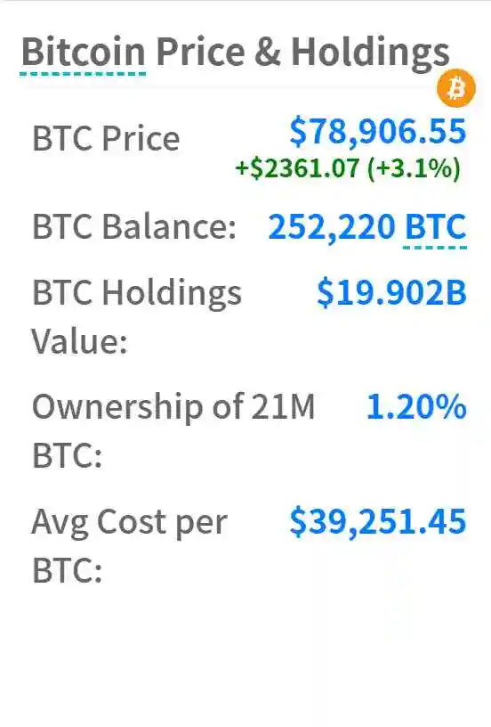 Micro Strategy 作为一家大量持有 BTC 的公司,目前,MicroStrategy 总计持有 252,220 枚比特币,总购买成本约为 99 亿美元,购买均价约为 39,266 美元,当前比特币持仓总价值 201.77 亿美元。