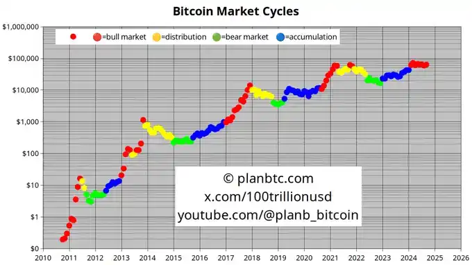 11 月:特朗普赢得大选,比特币价格达到 10 万美元。特朗普赢得选举,PlanB 认为比特币将迎来一次重大转折点。他指出,特朗普上台可能会带来对加密货币的友好政策,从而终结当前拜登/哈里斯政府对加密货币的「战争」,尤其是对 Gary Gensler 与 Elizabeth Warren 等监管高官的政策制衡将使比特币价格直接攀升至 10 万美元。