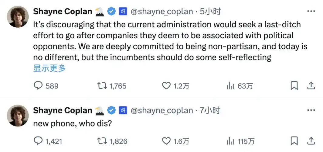 事件发生后,Coplan 本人于 X 相继发布了两则动态,第一则动态是在调侃要换新手机……第二则是正面回应表示:「令人沮丧的是,现任政府会采取最后一搏,追捕他们认为与政治对手有关联的公司。我们坚定地致力于无党派立场,今天也不例外,但现任政府应该进行一些自我反省,认识到采取更有利于企业、更有利于创业的方式可能会改变他们这次选举的命运。Polymarket 在本届选举周期为数千万民众提供了价值,同时没有伤害任何人。我们对此深感自豪。我可以昂首挺胸地说,美国的未来,尤其是美国企业家精神的未来从未如此光明。面对逆境,我们将持续建设。」