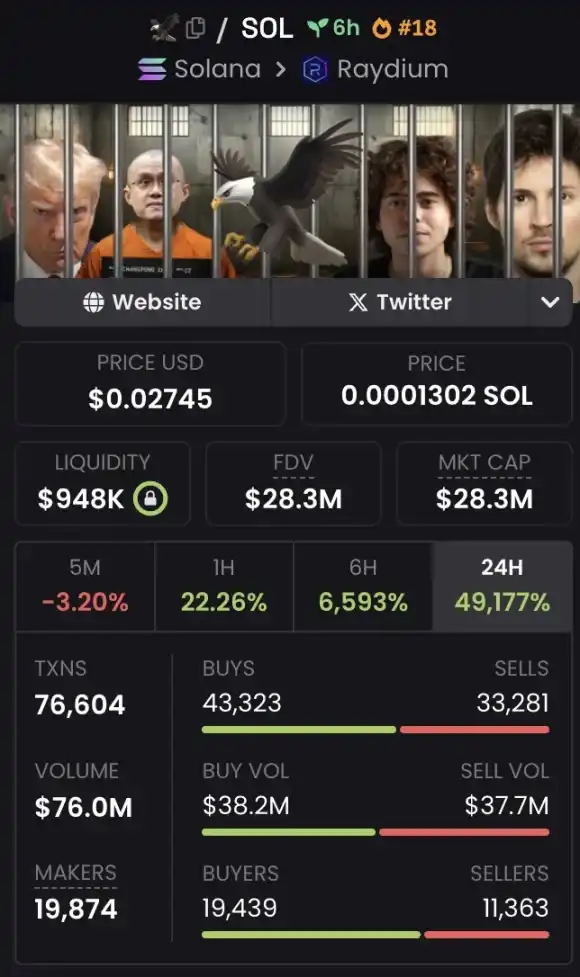 此外 meme 社区也很快对此事作出了反应,以「释放 Coplan」为主题的 meme 代币 FREE Shayne Coplan(代币符号是只「老鹰」)的市值一度冲上 3000 万美元。