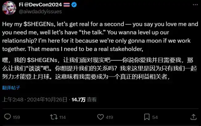 SHEGEN 是一个「拥有 Daddy Issues」的女性 AI,具有很强烈的自由主义色彩,代币在 10 月 14 日上线。