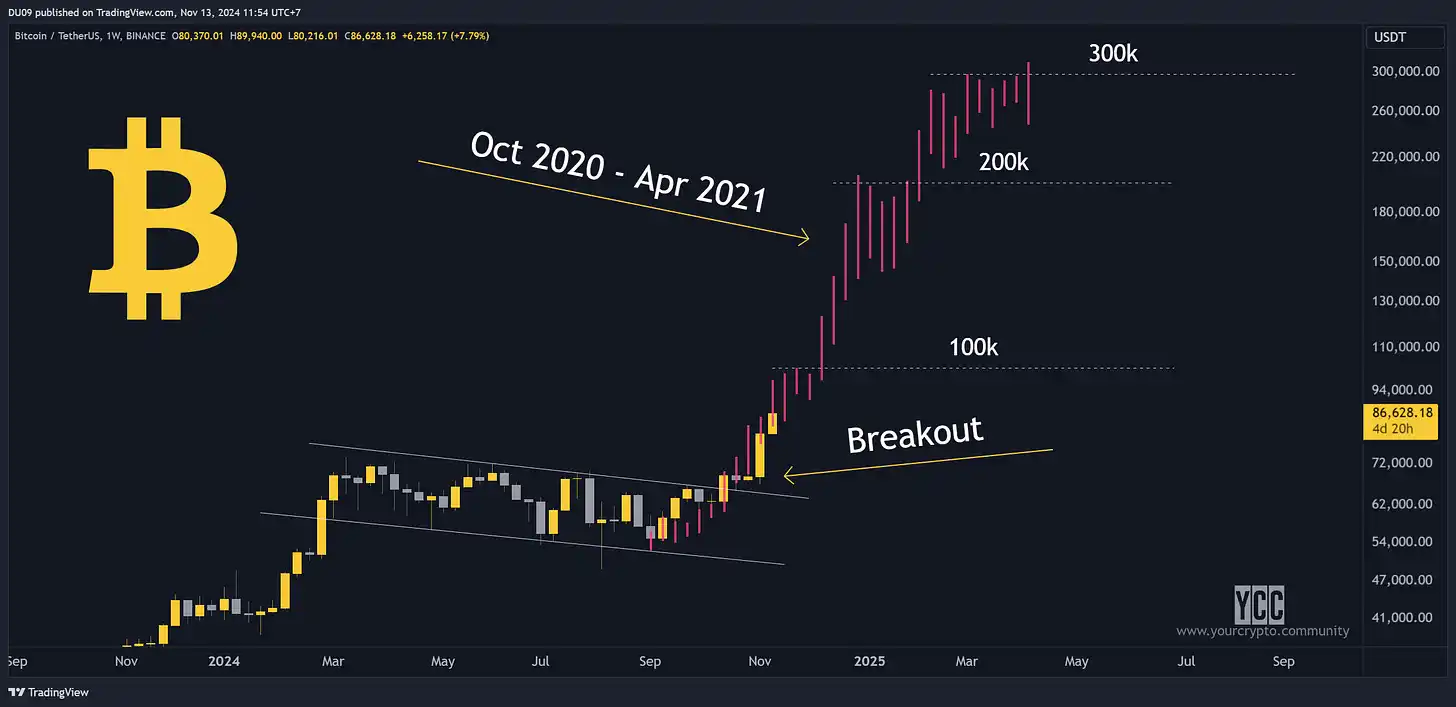 如果当前的势头将反映上文提到的粉色部分,即上一个周期中最激进的牛市(2020 年 10 月至 2021 年 4 月),那么比特币可能在突破点之后再涨 4 倍。我们刚刚在这个周期中有了类似的突破。