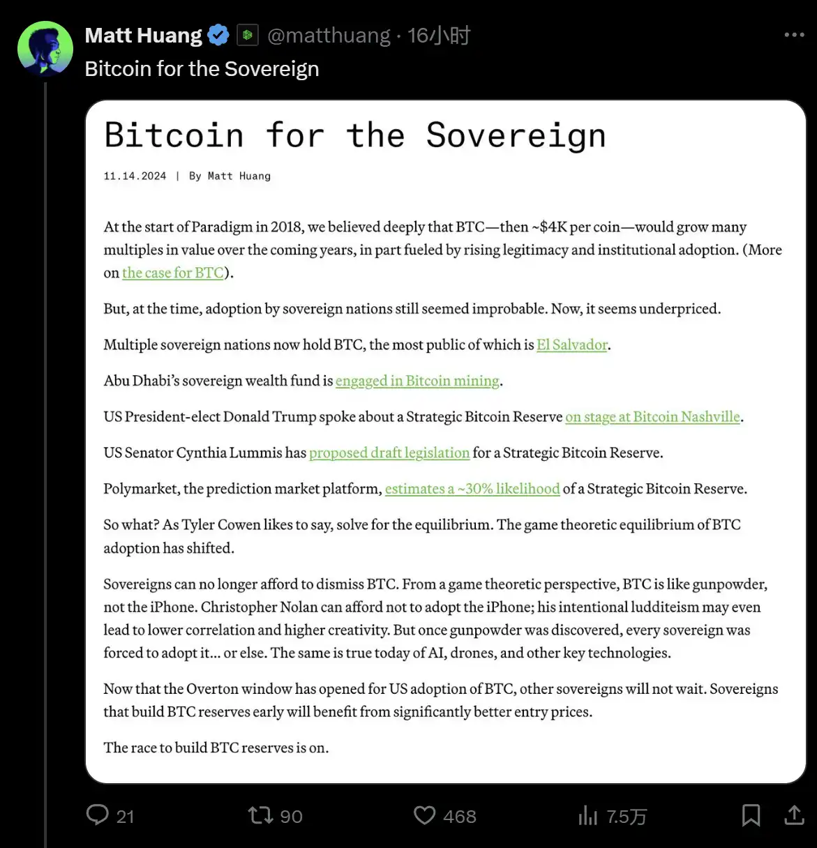 2.Paradigm 联创:早期建立比特币储备的主权国家将从显著更好的入场价格中受益。@matthuang