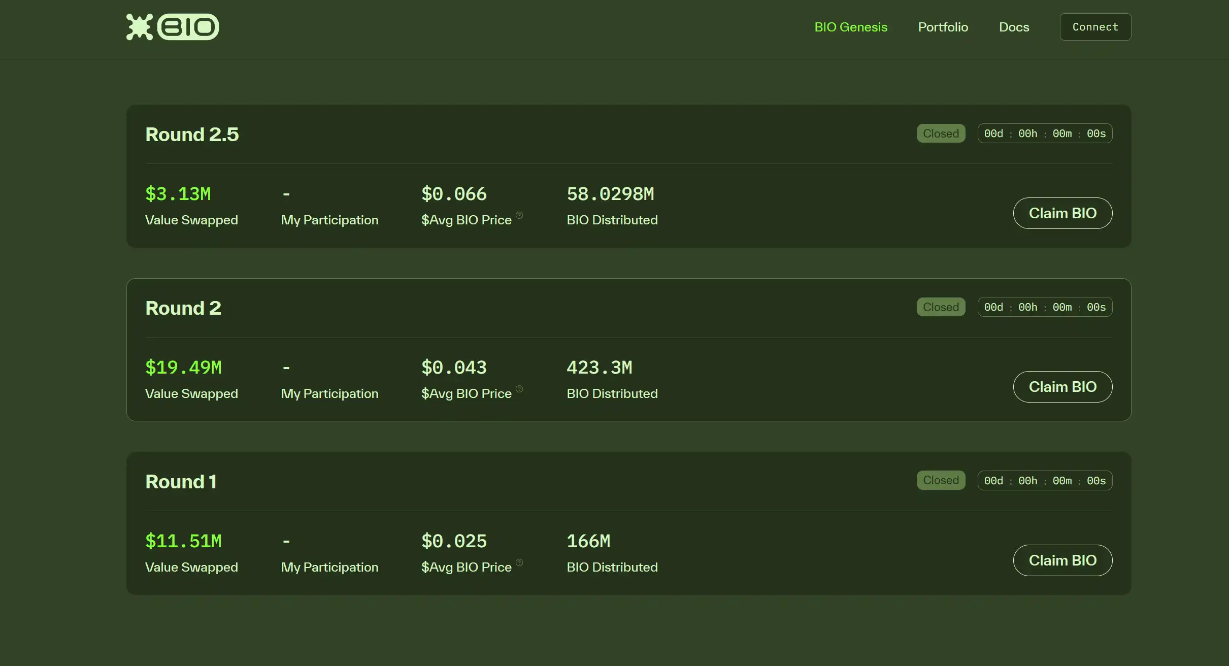8 月 9 日,BIO Protocol 开启了第一轮 Bio Genesis 代币销售,平均价格为 0.025 美元,交易量达 1151 万美元。第二轮次的代币销售在 9 月 30 日进行,这次 BIO 的平均价格已经有了 72% 的涨幅,为 0.043 美元,交易量也升至 1949 万美元。直到 11 月 10 日的第 2.5 轮次公开拍卖时,BIO 价格升至 0.066 美元,较第一轮涨幅 264%。目前,BIO Protocol 的拍卖轮次已经结束。