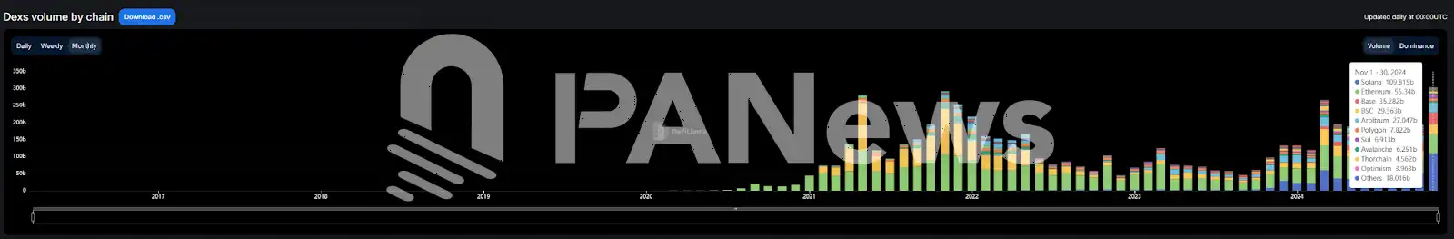 用户活跃的背后,带来的是交易金额的大幅提升。据 Defillama 数据显示,Solana 网络 11 月去中心化交易所(DEX)交易量首次突破 1000 亿美元,达 1098 亿美元。这一数据接近以太坊主网月度 DEX 交易量的两倍(550 亿美元),相比 10 月的 525 亿美元增长超过 100%。