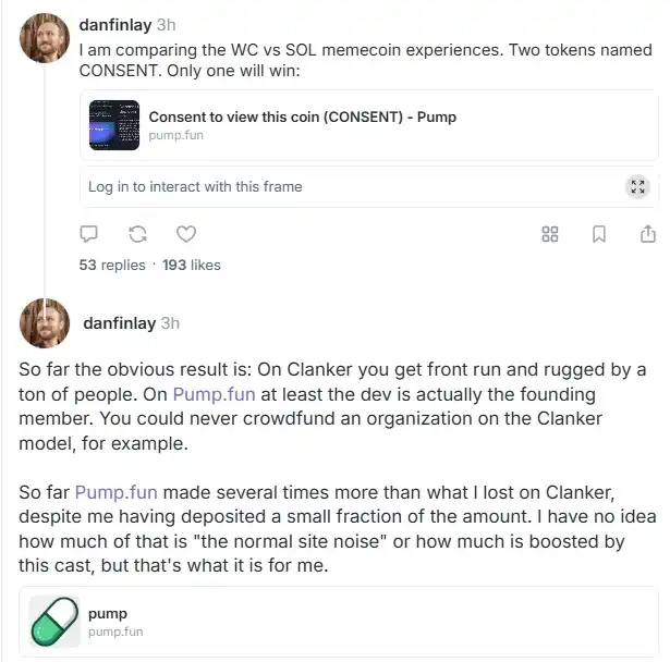 「正在比较 WC(Warpcast)和 SOL 的 Meme 币体验。有两个名为 CONSENT 的代币,最终只有一个会胜出。到目前为止的结果是:在 Clanker 上,会被大量的人抢跑和 rug;而在 pump.fun 上,至少开发者是真正的创始成员。例如,绝不可能用 Clanker 的模式为一个组织进行众筹。即使我在 pump.fun 上投入的金额只是 Clanker 的一小部分,但收益已经是在 Clanker 上损失的好几倍。我不确定这其中有多少是『正常的站点噪音(the normal site noise)』,又有多少是因为这个活动的加成,但对我来说,事实就是如此。」