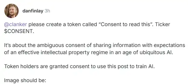今日午间 11 时 8 分,MetaMask 联合创始人 Dan Finlay 通过 AI 代理 clanker 在 Base 网络上部署了 Meme 代币 CONSENT,该代币在 5 分钟的时间里上涨至 450 万美元市值,而后在 200 万-300 万美元区间震荡。