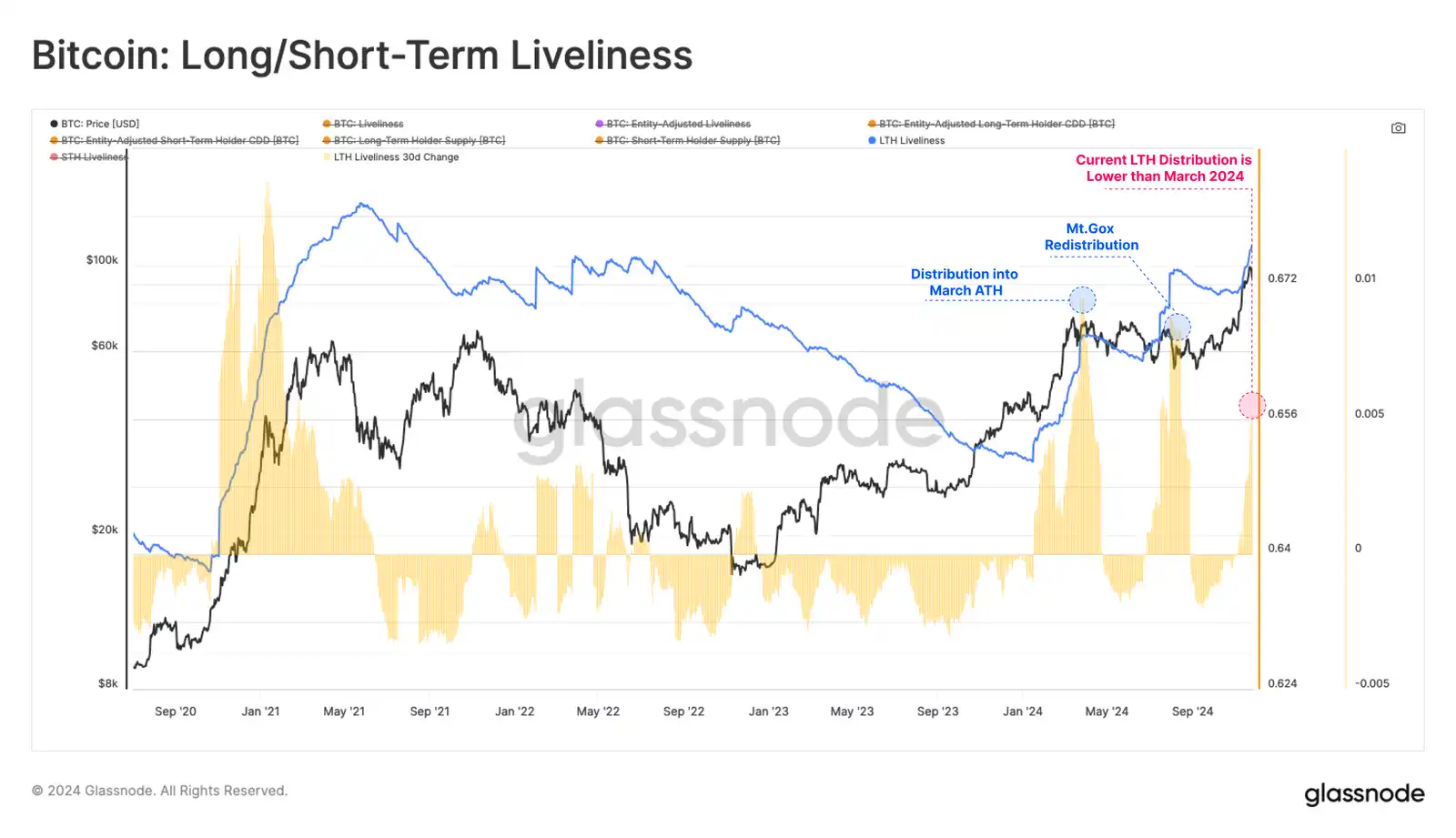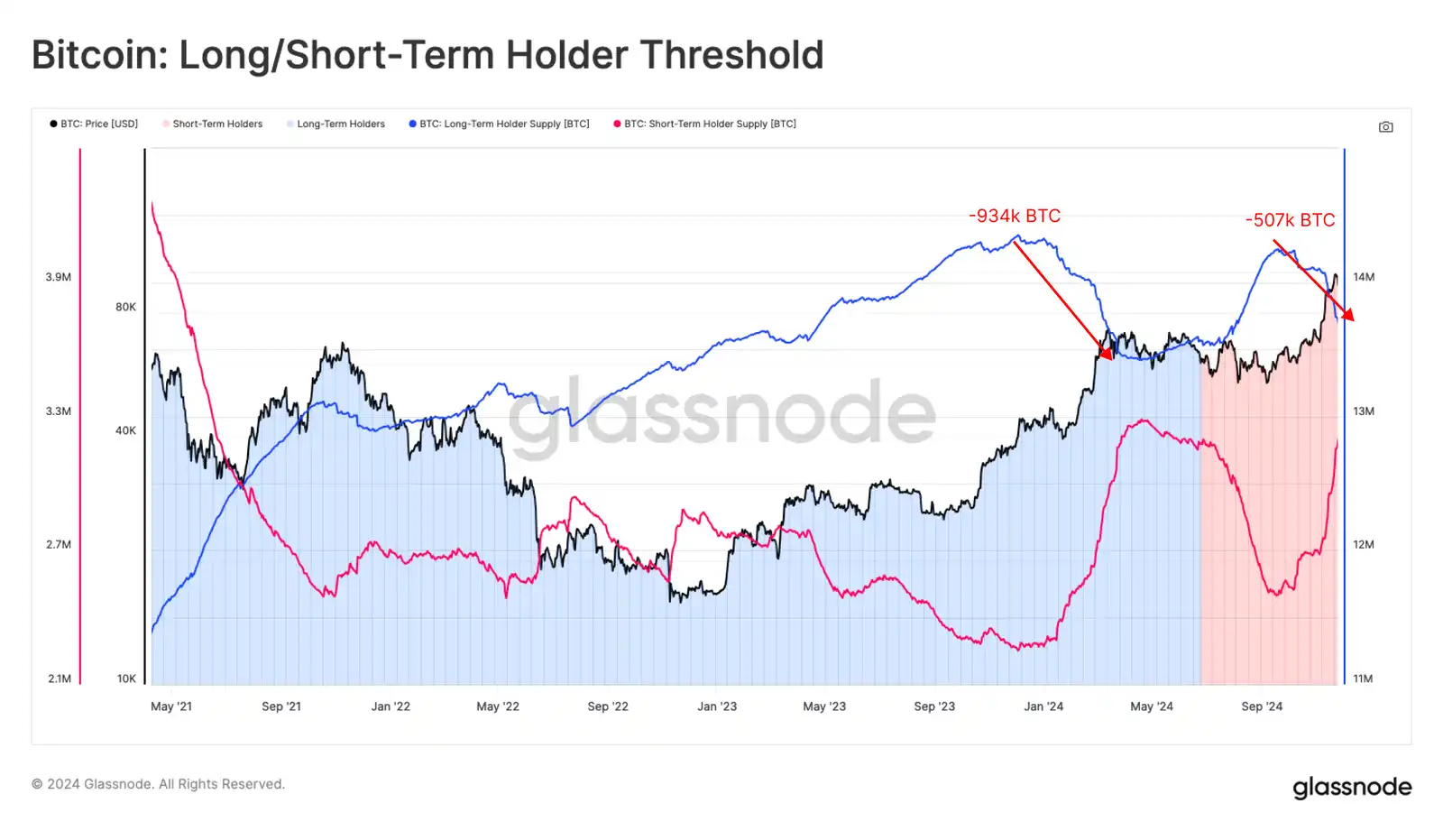 自 9 月份 LTH 供应量达到峰值以来,该群体现已售出了 507,000 枚 BTC。这是一个相当大的规模;然而,相对于 2024 年 3 月 ATH 反弹期间的 93.4 万 BTC 而言,其规模较小。