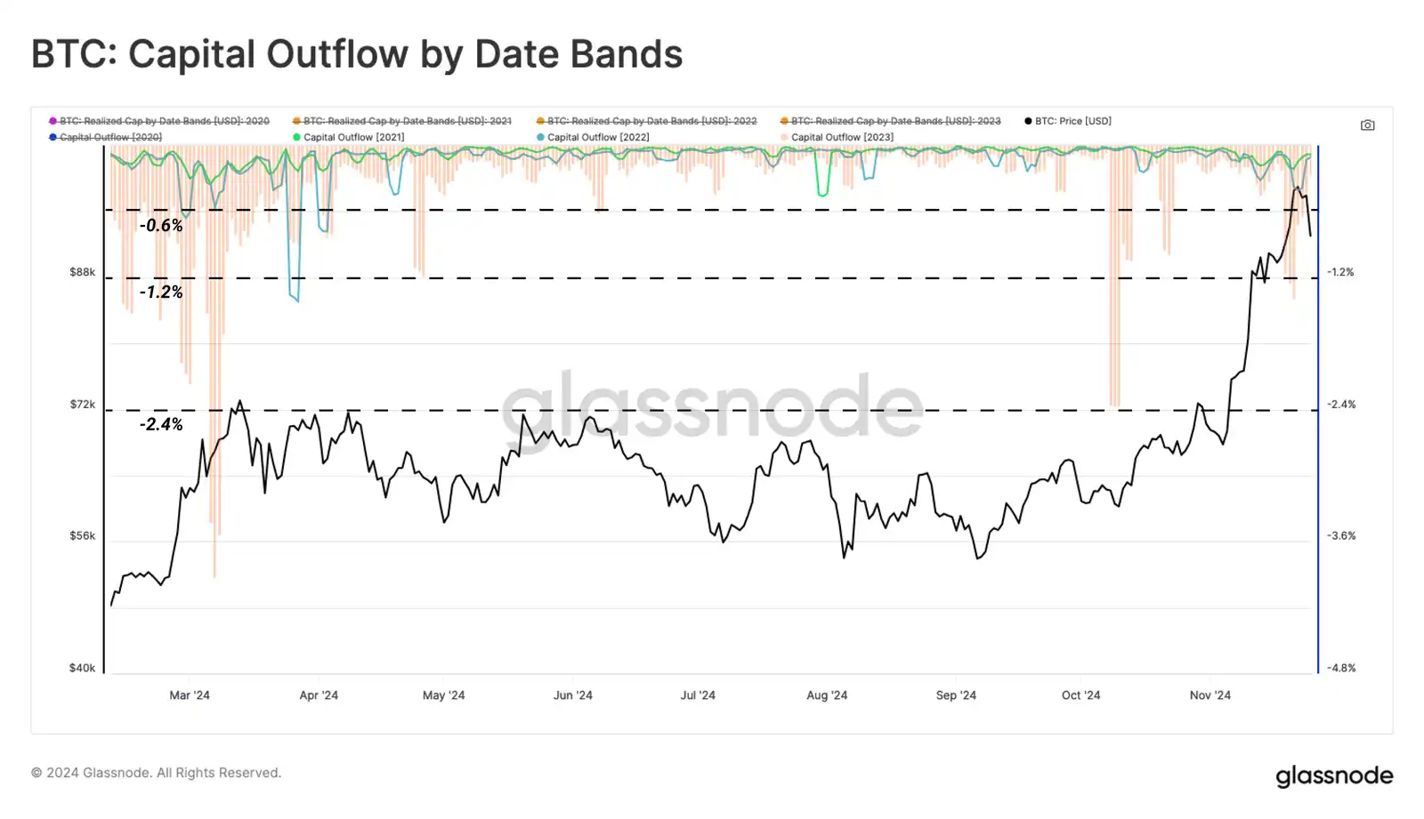 2024 年 3 月,在 ETF 推出后几个月的升值之后,几个供应集群的供应在 4 万至 7.3 万美元之间易手。在随后七个月的价格波动中,该地区成为历史上最重要的供应集群之一。