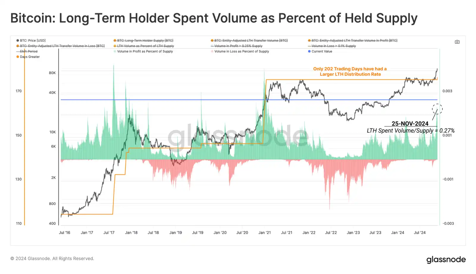 通过评估从盈利头寸交易的长期持有者总供应量的百分比,我们看到了类似的情况。目前,平均每天出售 LTH 供应量的 0.27%,所有交易日中只有 177 个交易日出售率较高。