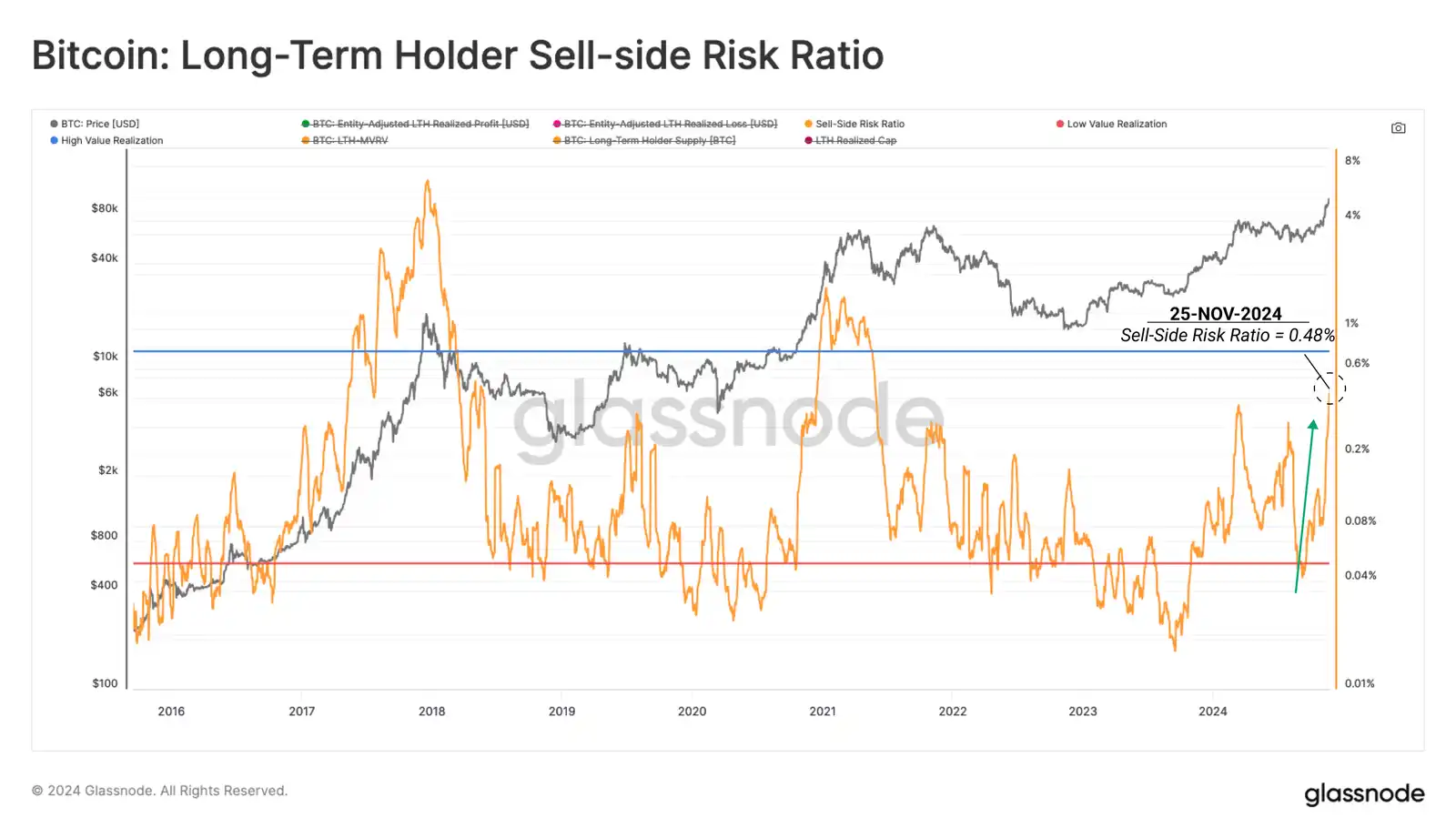 评估 LTH 的盈亏量之间的平衡,我们可以看到两者的比例在 11 月份迅速加速。根据定义,这是由于在此价格发现机制期间 LTH 供应不足而造成损失。