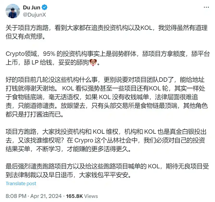 关于项目方跑路,看到大家都在追责投资机构以及 KOL,我觉得虽然有道理但又有点荒缪。