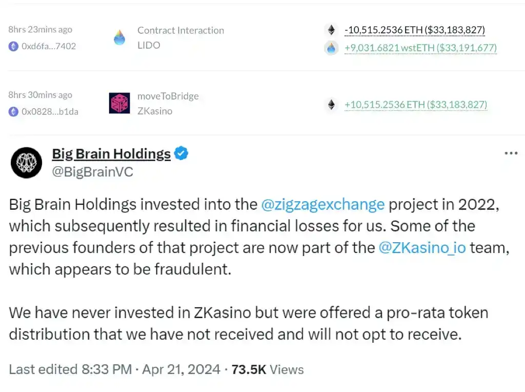 4 月 22 日,此前曾被披露为 ZKasino 投资机构之一的 Big Brain Holdings 发文「辟谣」,否认参与过 ZKasino 的融资。