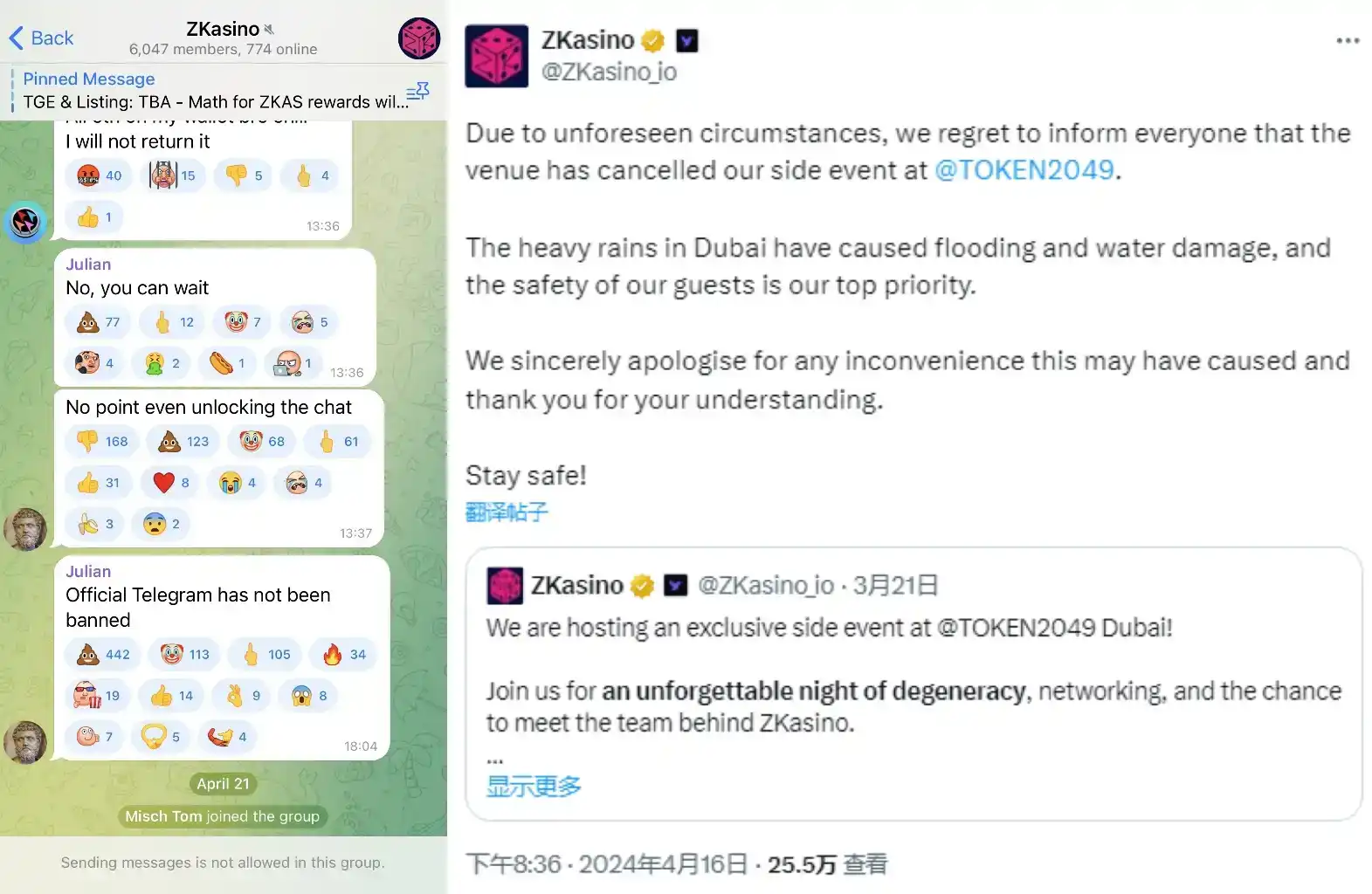 许是多方施压,ZKasino 终于进行了一个简短的回应:目前存在很多 FUD 传言。ZKasino 网络仍将继续上线,此前由于交易所上市而(主网)有所推迟。