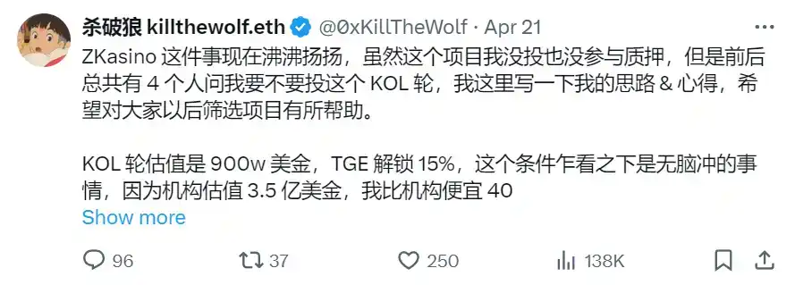 ZKasino 这件事现在沸沸扬扬,虽然这个项目我没投也没参与质押,但是前后总共有 4 个人问我要不要投这个 KOL 轮,我这里写一下我的思路 & 心得,希望对大家以后筛选项目有所帮助。