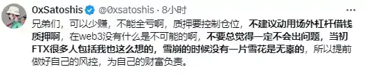兄弟们,可以少赚,不能全亏啊,质押要控制仓位,不建议动用场外杠杆借钱质押啊,在 web3 没有什么是不可能的啊,不要总觉得一定不会出问题,当初 FTX 很多人包括我也这么想的,雪崩的时候没有一片雪花是无辜的,所以提前做好自己的风控,为自己的财富负责。