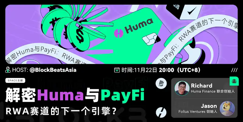 11 月 22 日,律动 BlockBeats 邀请到了 Huma Finance 联创 Richard Liu 和 Folius Ventures 创始人 Jason,以《解密 Huma 与 PayFi:RWA 赛道的下一个引擎》为主题,聊聊 RWA PayFi 会有哪些新叙事。