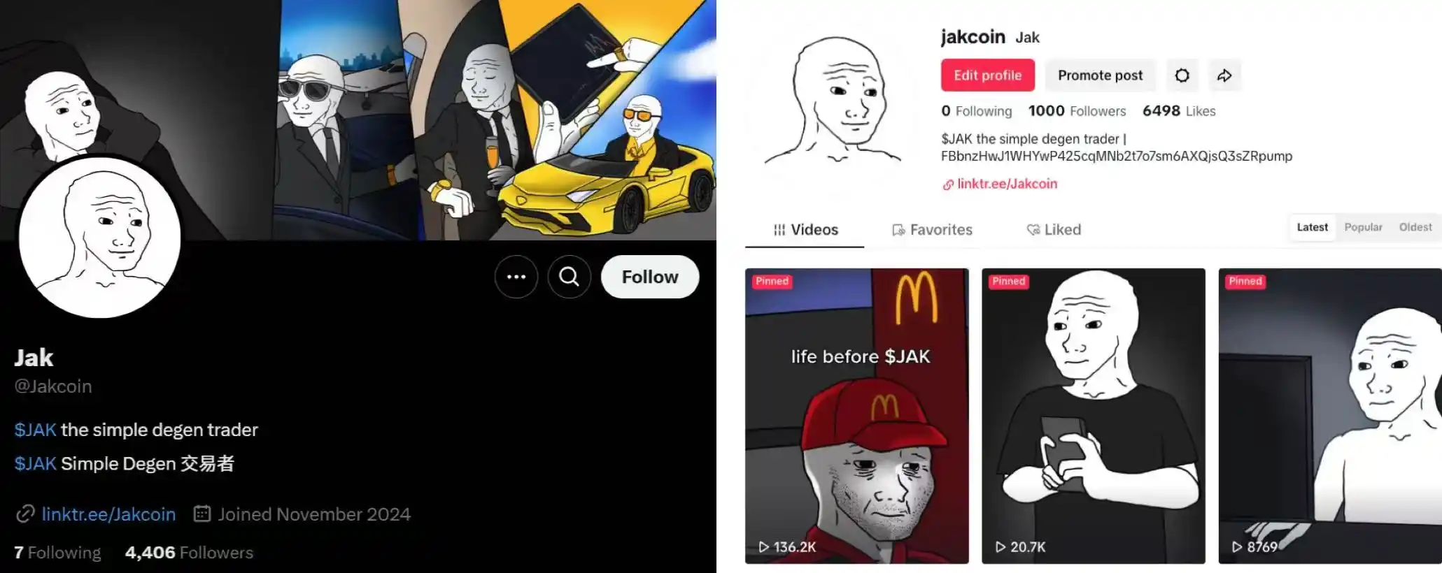 JAK:我是 JAK,一个没有女友、没有工作、没有自信的普通人,但是当我买入这个 meme 后,全世界都是我的了。jak 玩的概念正符合 meme 的精髓,暴富自由的梦想!