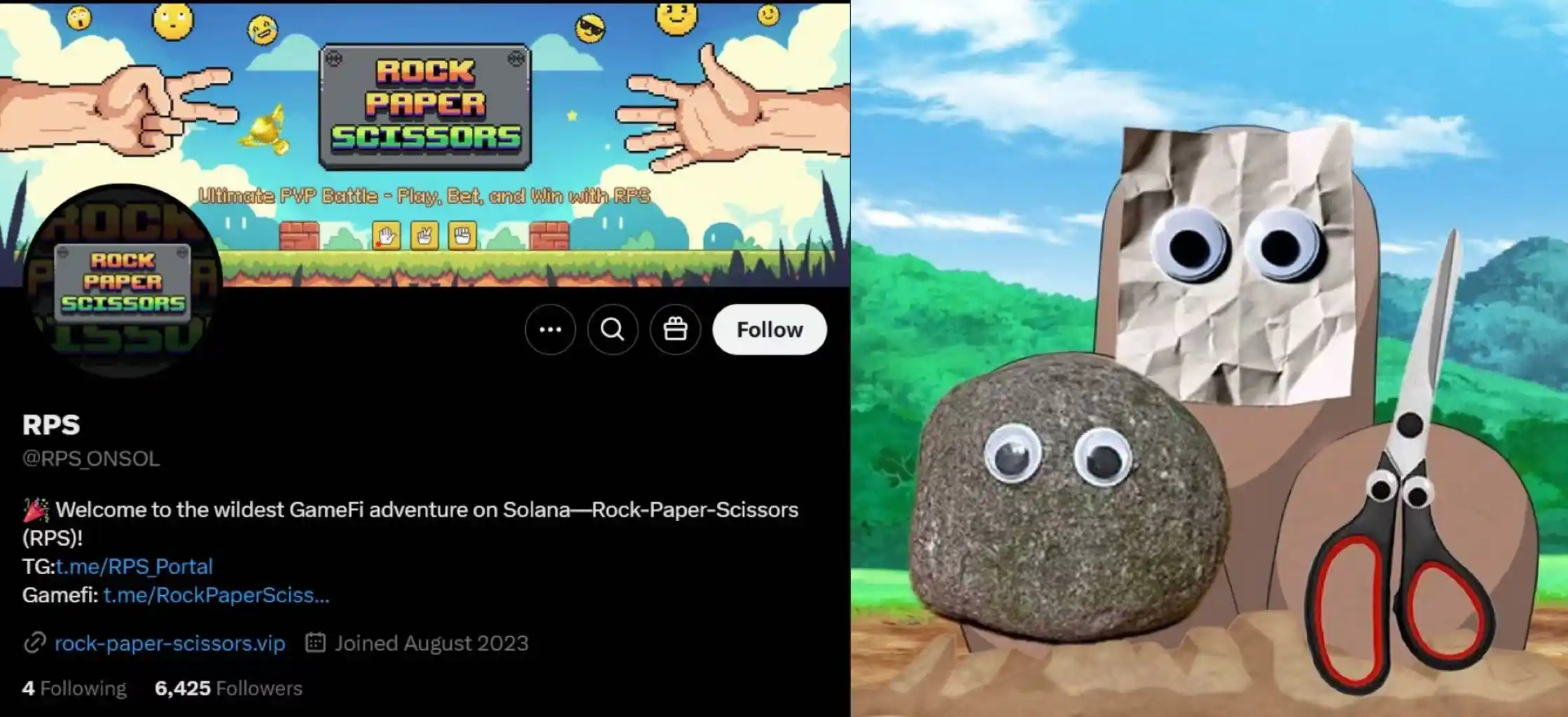Rps 名字的灵感来自大家熟悉的游戏「石头剪刀布」,也就是 Rocky、Papery、Scissory 的缩写。代币属于 Solana 区块链上的一款 PVP(玩家对战玩家)游戏,进入一个刺激的 GameFi 世界,可以在游戏中和其他玩家对战,边玩边赚,市值五个小时冲击 480M,爆拉 500 倍的涨幅。