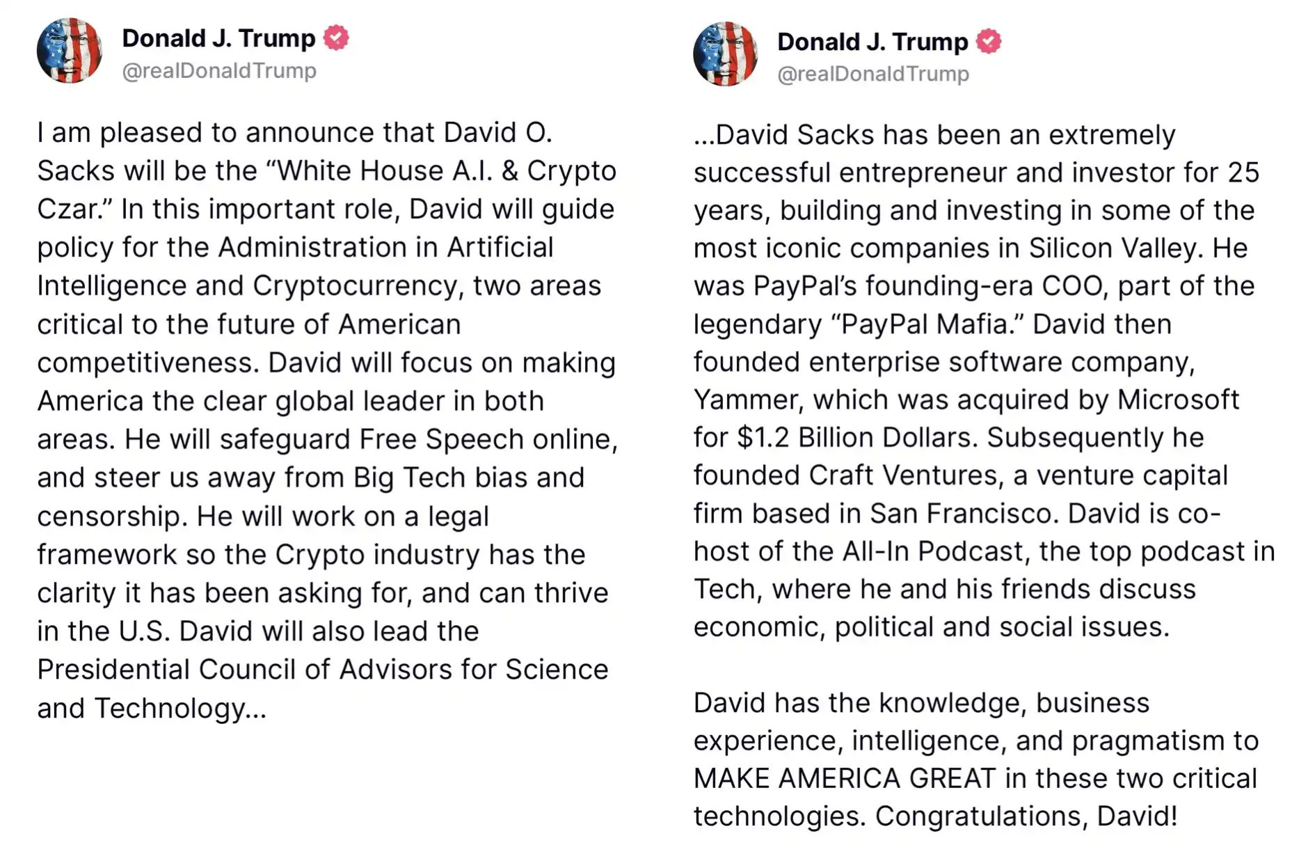 特朗普这样介绍 David Sacks,「他在过去 25 年中是一位极为成功的企业家和投资者,曾参与打造和投资硅谷最具标志性的一些公司。他曾是 PayPal 创始时期的首席运营官,是传奇的「PayPal 黑帮」成员之一。此后,他创立了企业软件公司 Yammer,后被微软以 12 亿美元收购。随后他创立了总部位于旧金山的风险投资公司 Craft Ventures。David 还是知名科技播客《All-In Podcast》的联合主持人,他与朋友们在节目中探讨经济、政治和社会问题。」