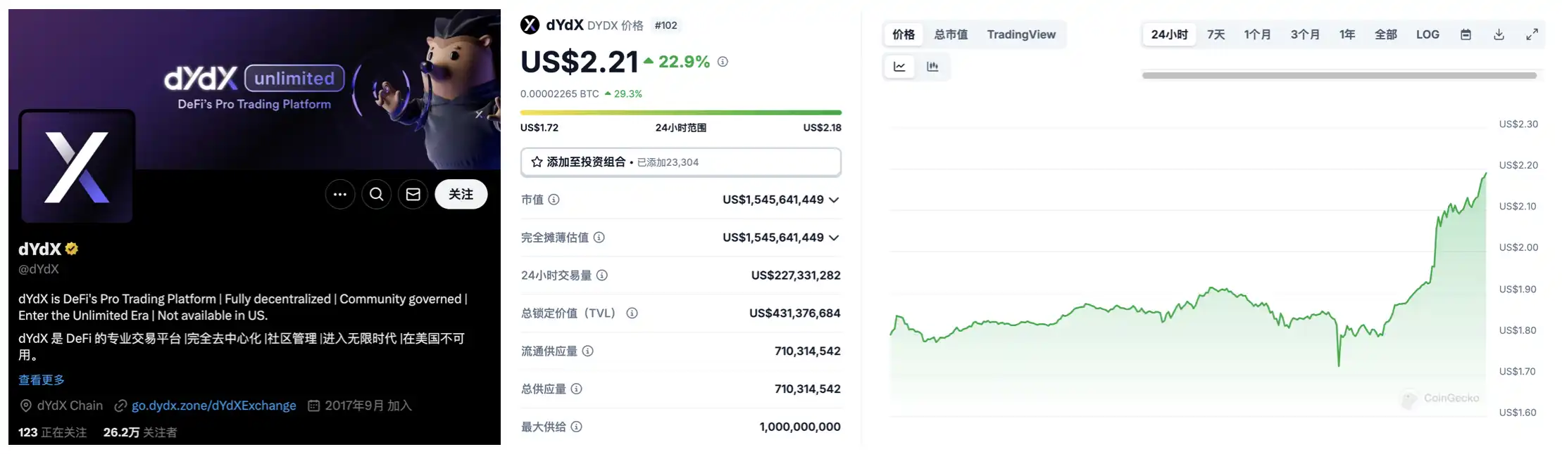 在今日特朗普政府宣布加密负责人旗下 VC David Sacks 曾投资 dYdX 消息公布后,DYDX24 内涨幅为 24.53%。