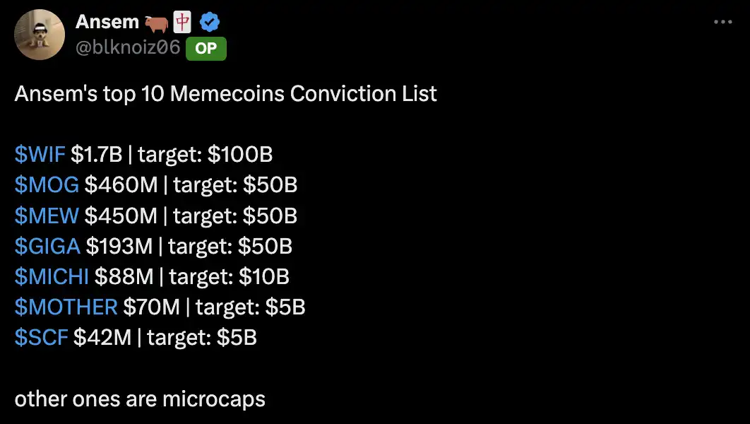 那在当前除了 Murad 清单里那些已经被市场发现以及产生溢价的 Cult Meme,诸如 SPX、MOG 等,我们还能有其它选择吗?根据 Murad 对 Cult Meme 的定义——中型市值 六个月以上上线历史的要求来看,拥有清晰愿景以及文化凝聚力的猫主题 meme MEW 是当下很符合 Cult Meme 定义的又一高潜力标的。另一顶流 meme 币 KOL Ansem 则直接将 MEW 加入了他的十大 meme 清单。