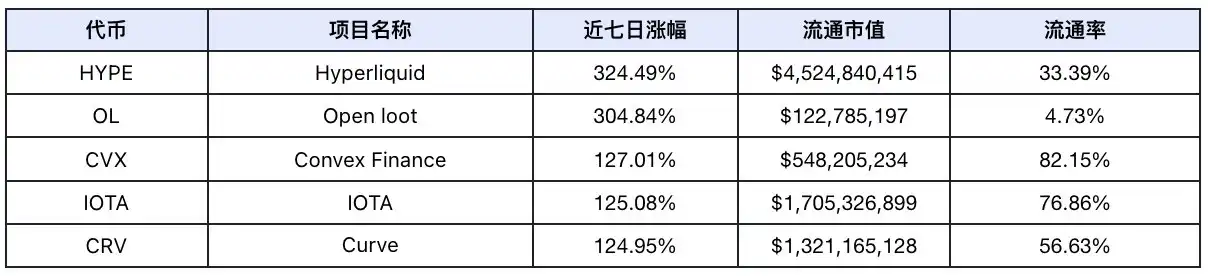 过去一周市场代币涨幅前 5 名(未计入交易量过小的代币和 meme 币),数据来源:Coinmarketcap