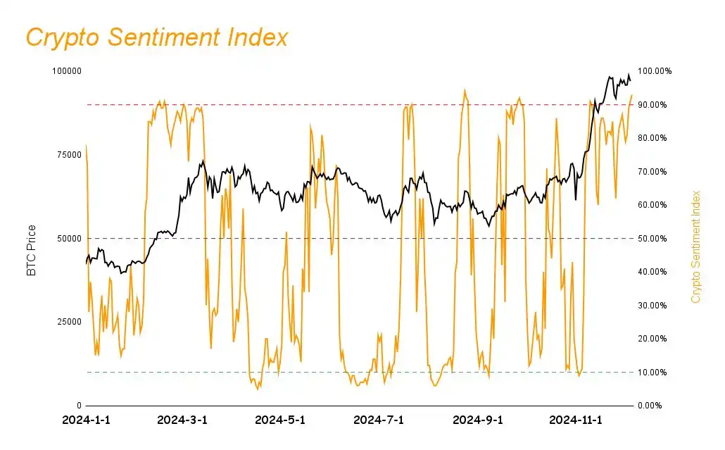 BTC 价格在周四的时候短时间突破 10 万美元,虽然后续有所下跌,市场情绪处于极度贪婪阶段,预计之后仍会存在一定回调的可能性,投资者需要提高风险防范。