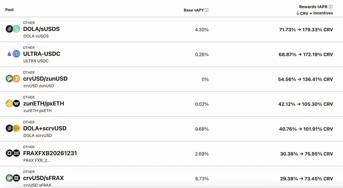 CRV:Curve 是一个去中心化交易所,基于以太坊开发的兑换池协议,提供滑点低(深度好)的稳定币交易。本周 Curve 的稳定收益率获得了大幅的提升,部分池子的年化收益率提升到了 100% 以上,并且本周由于市场交易情绪比较好,从而吸引了大量的链上套利用户进入 Curve 中。