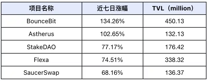 过去一周市场项目 TVL 涨幅前 5 名(未计入 TVL 较小的公项目,标准为 3000 万美元以上),数据来源:Defilama