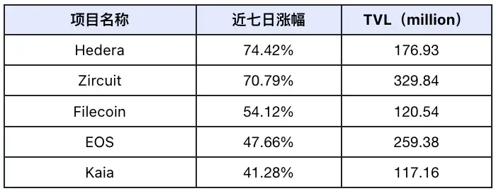 过去一周市场公链 TVL 涨幅前 5 名(未计入 TVL 较小的公链),数据来源:Defilama